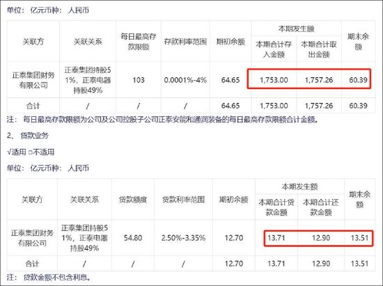 值得注意的是,正泰安能母公司正泰电器出现将大额资金存于集团财务公司情形,呈现出高存低贷的特征。2024年年报显示,正泰电器存于集团财务公司资金期末余额高达60.39亿元,期间发生额规模超170亿元;而期末才能够财务公司获取的贷款仅为13.51亿元,期间发生额不超过15亿元。