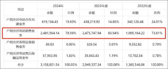 公司设立于2015年,自成立以来一直专注于户用光伏业务,面向以全国范围农村地区农户为主的自然人业主提供户用光伏电站整体解决方案,业务过程覆盖屋顶光伏系统的合作开发、销售、勘测设计、安装及售后运维等全生命周期的各个环节。其中,户用光伏电站销售业务24年收入占比高达78.56%。